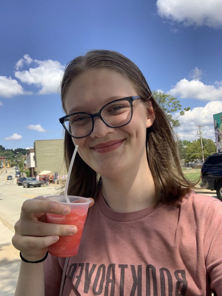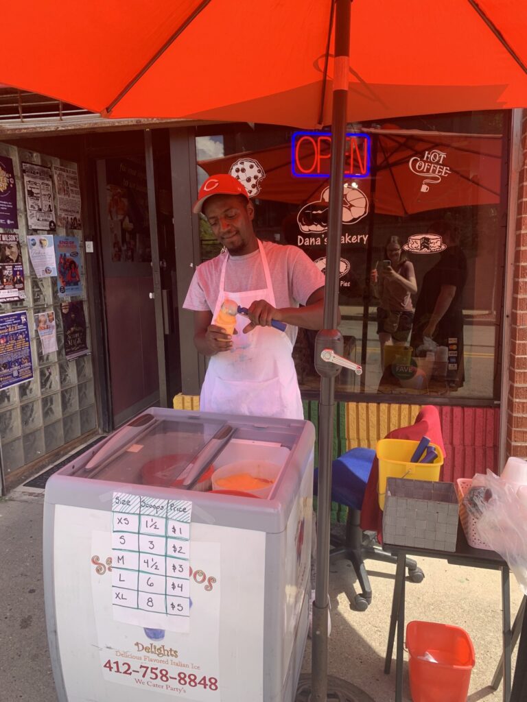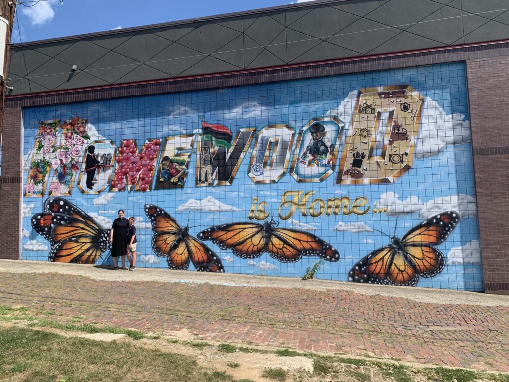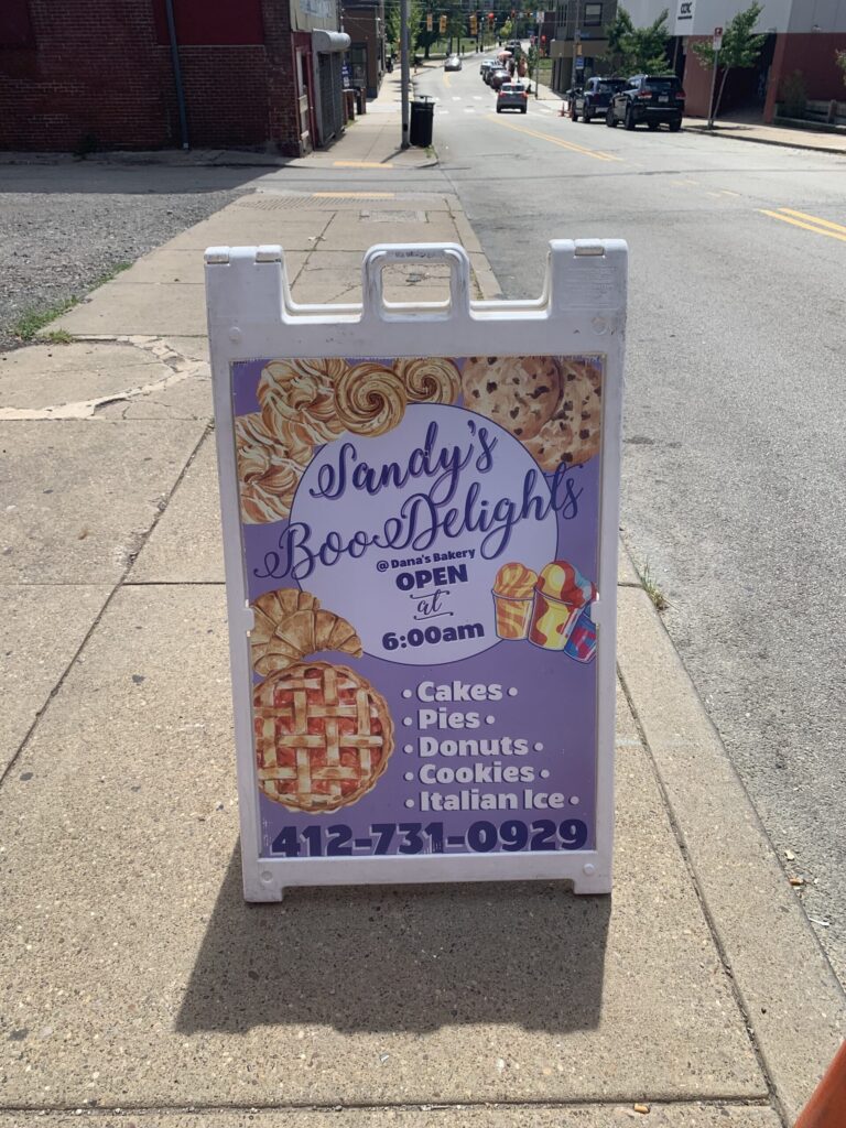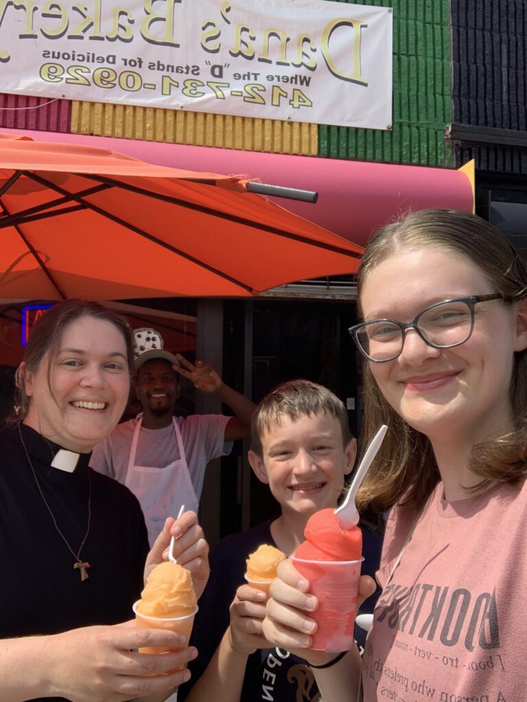 Continuing our effort to visit daytime-only locations before the start of the school year, we drove to Homewood South to check out Sandy Boo’s Delights at Dana’s Bakery. Outside the bakery, established in 1979 and full of delicious-looking baked goods, is Sandy Boo’s, an Italian ice stand. After a nice conversation with the people working there, we grabbed cups of reasonably priced, refreshing Philadelphia water ice. Pippa had watermelon and Edmund and Liddy had mango. We also took a walk through the neighborhood, seeing the Carnegie library, YMCA, ornate Holy Rosary Church (currently for sale), and many brightly-colored murals. Homewood South has the largest business district of the three neighborhoods that make up Homewood; we’ll catch Homewoods North and West on a future visit.